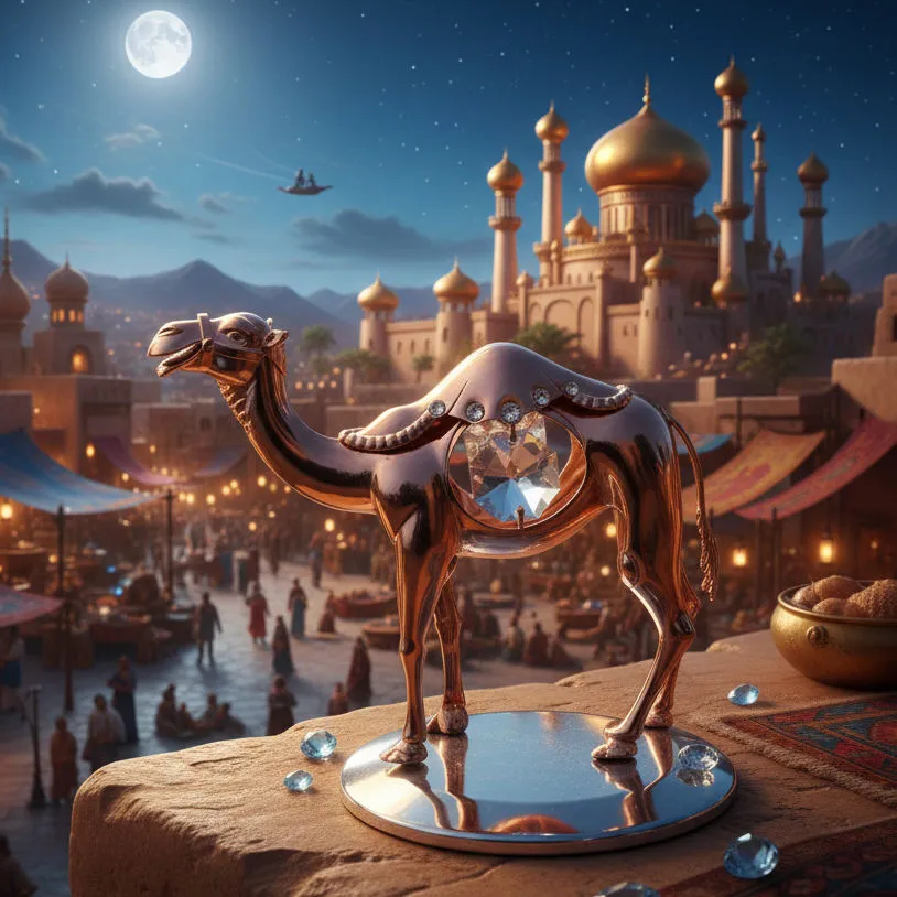 Centrální kyvný křišťál: Uprostřed těla velblouda je zasazen velký, čirý broušený křišťál, který je upevněn tak, aby se při pohybu jemně kýval a zachycoval světlo z každého úhlu.
