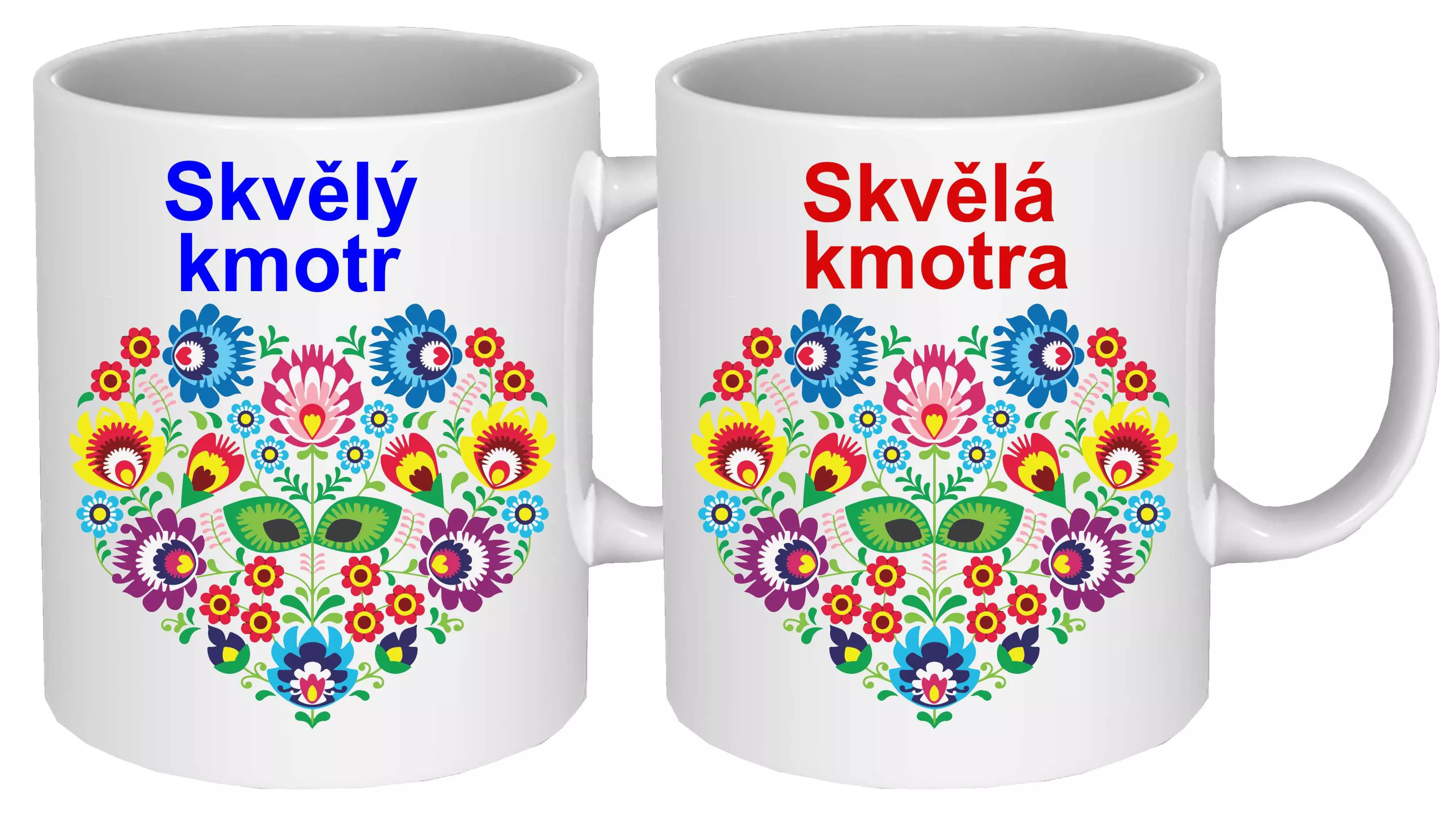 Hrnek bílé barvy s nádherným folklórním srdíčkem a nápisem.