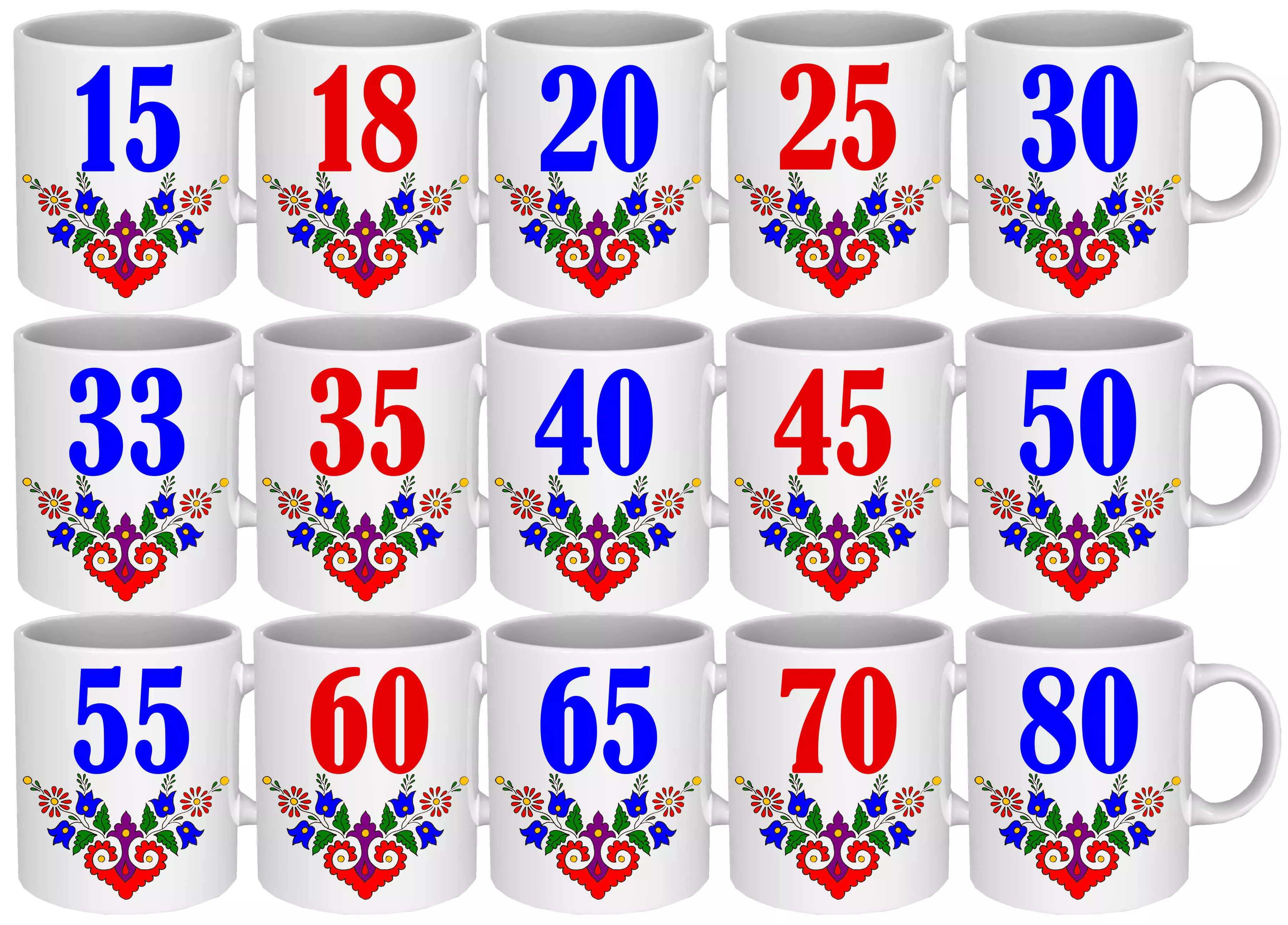 Porcelánový hrnek je bílé barvy s folklórním obrázkem a výročním číslem.