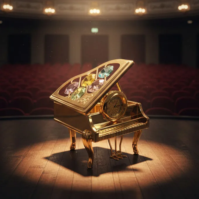 Pět barevných křišťálů: Odklopené víko klavíru je zdobeno pěti velkými broušenými křišťály v různých odstínech (fialová, zelená, žlutá, světle růžová a modrá), které vytvářejí nádhernou hru světla.