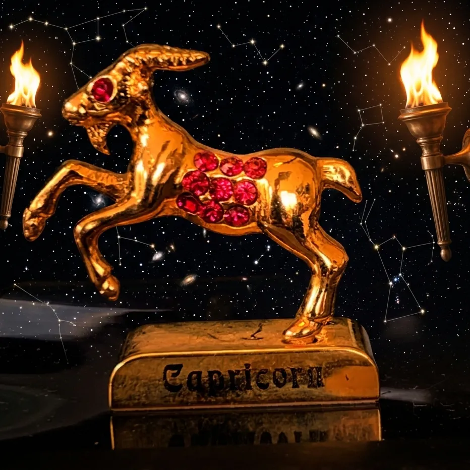 Stabilní podstavec s nápisem: Figurka stojí na pevné zlaté základně s jasně čitelným nápisem „Capricorn“. V odrazu na zlaté základně se jemně rýsuje plamen pochodně.